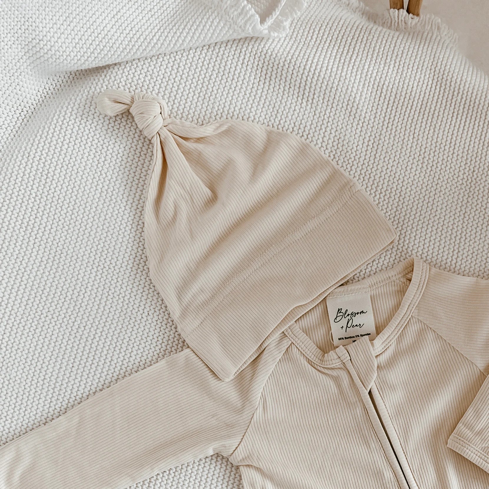 The Ribbed Bamboo Knotted Beanie is made from a buttery soft bamboo and jersey blend, and designed to match the Ribbed Bamboo Clothing Collection.